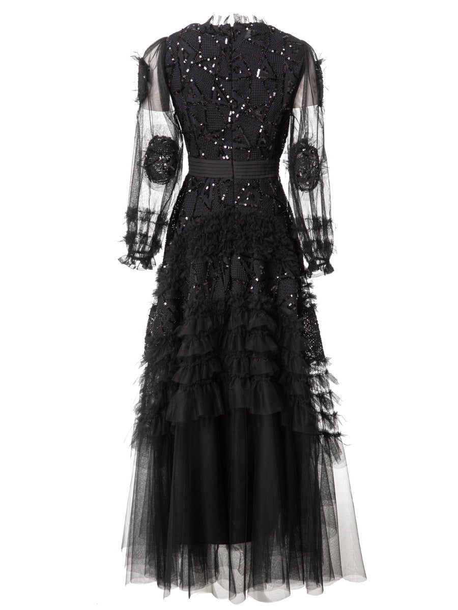 The Eliana Embroidered Sequin Mesh Maxi Dress is the epitome of refined glamour. Adorned with intricate sequin embroidery, this dress exudes elegance from every angle. Its long sleeves provide a touch of modest sophistication, while the layered, ruffled skirt creates a voluminous, fairy-tale effect. Perfect for any special occasion, this dress promises to captivate with its delicate detailing and stunning silhouette.
