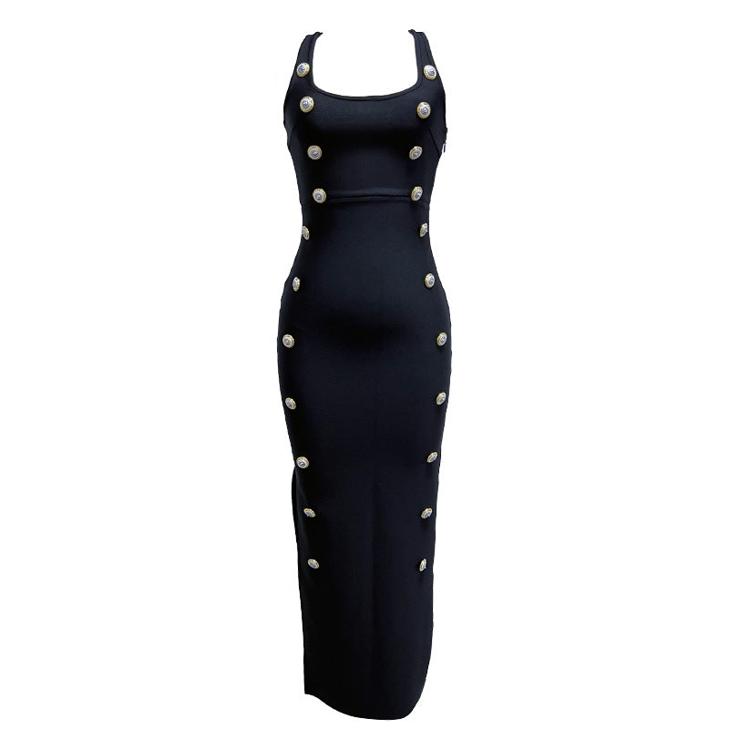 Etta Black Button Detail Bandage Maxi Dress draws inspiration from the classic bandage silhouette, reimagined with refined button detailing that elevates the overall design. The thoughtfully placed buttons create a striking visual focal point, showcasing sophistication and modern elegance.The open-back design beautifully accentuates the waistline, adding depth and graceful dimension. The figure-hugging fit is complemented by a sleek maxi-length silhouette, enhancing natural curves while creating a confident and alluring look. Crafted from high-stretch bandage fabric, it offers sculpting support while ensuring a comfortable, body-contouring fit. Perfect for formal events, semi-formal gatherings, or vacation occasions, this dress effortlessly captures the balance between elegance and sensual sophistication.