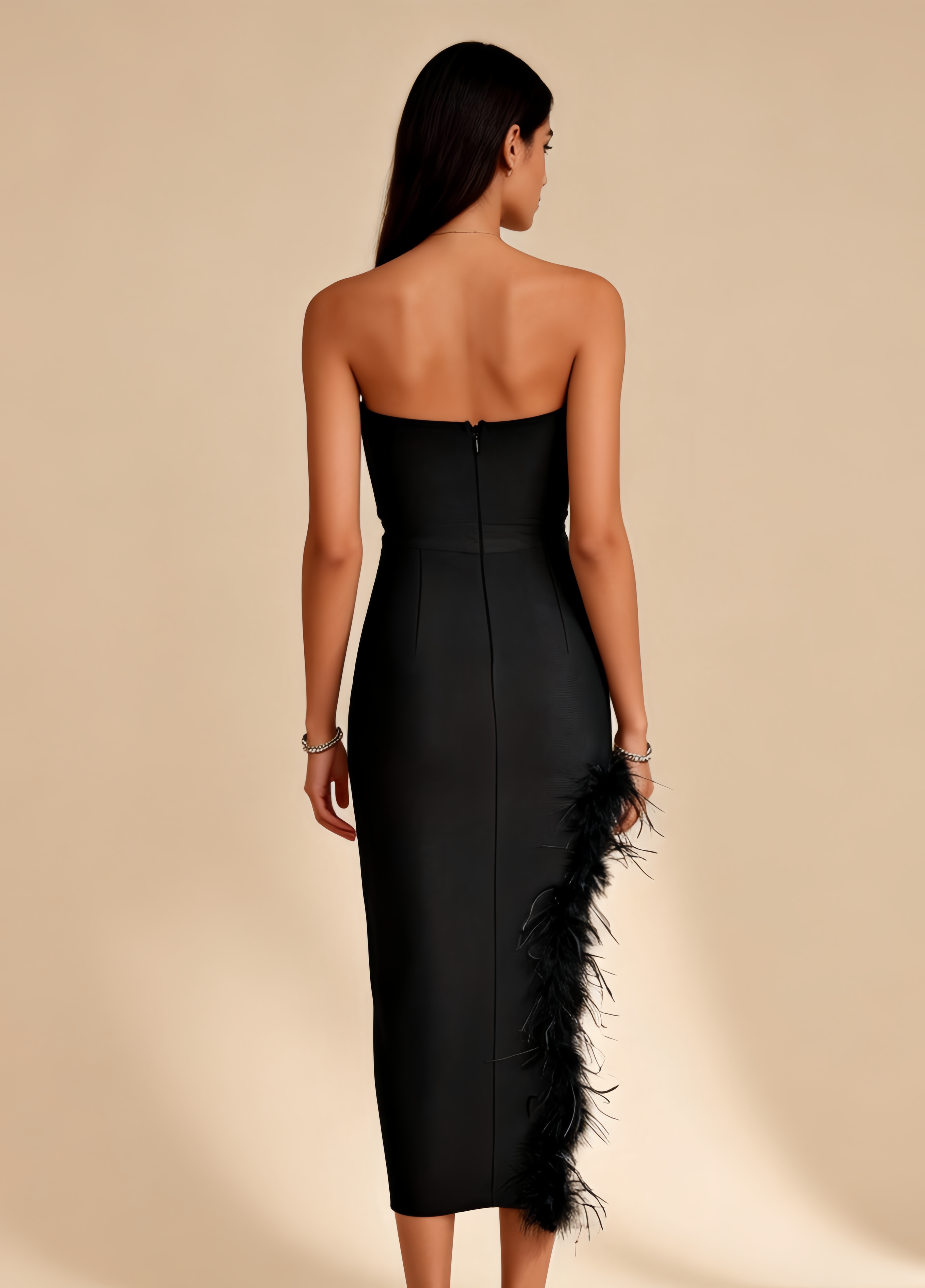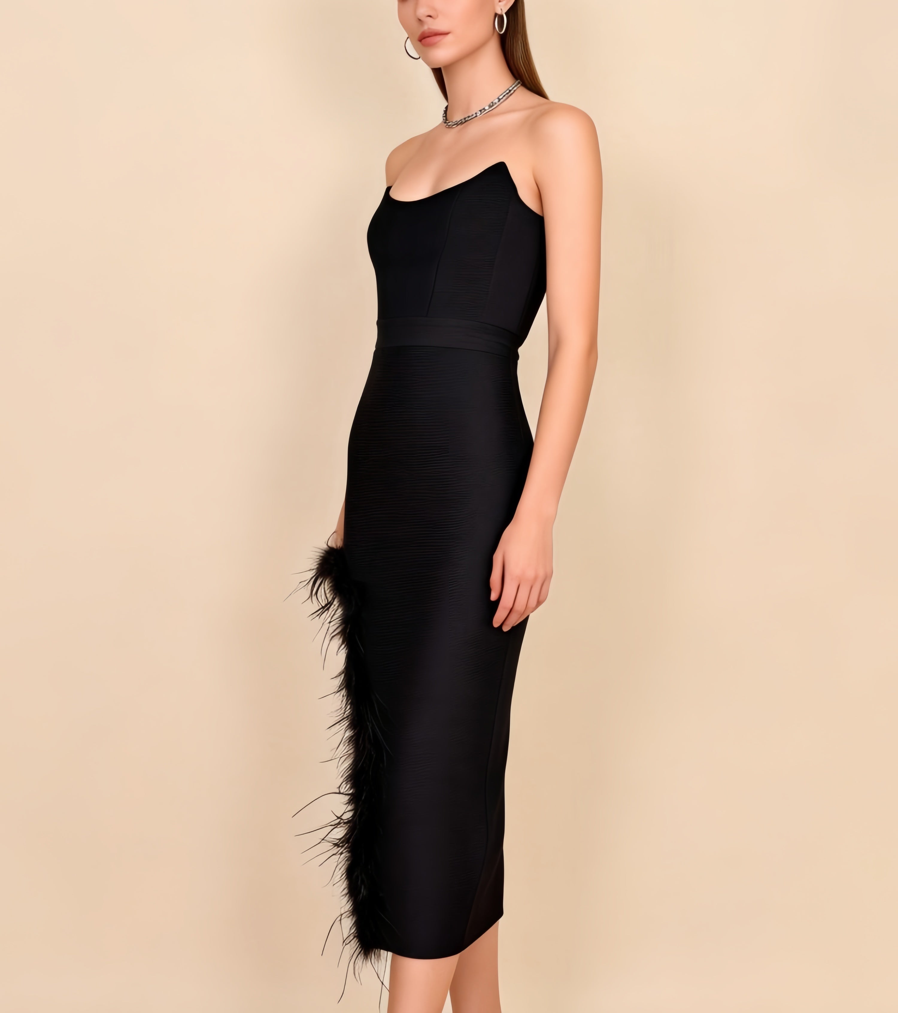 The Gemma Black Bandage Midi Dress hugs your curves with a sleek, sleeveless, off-shoulder design. A side slit and feather accents add movement and drama, making it perfect for evenings, parties, or any moment to shine.