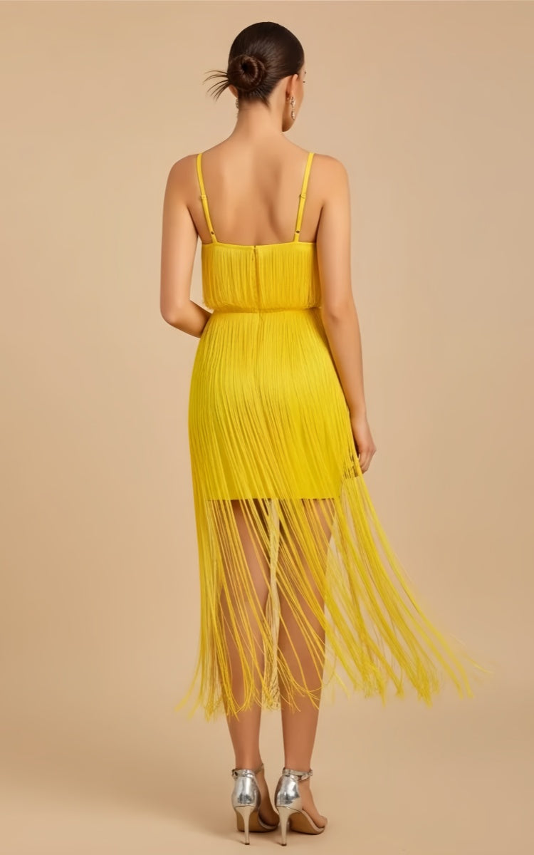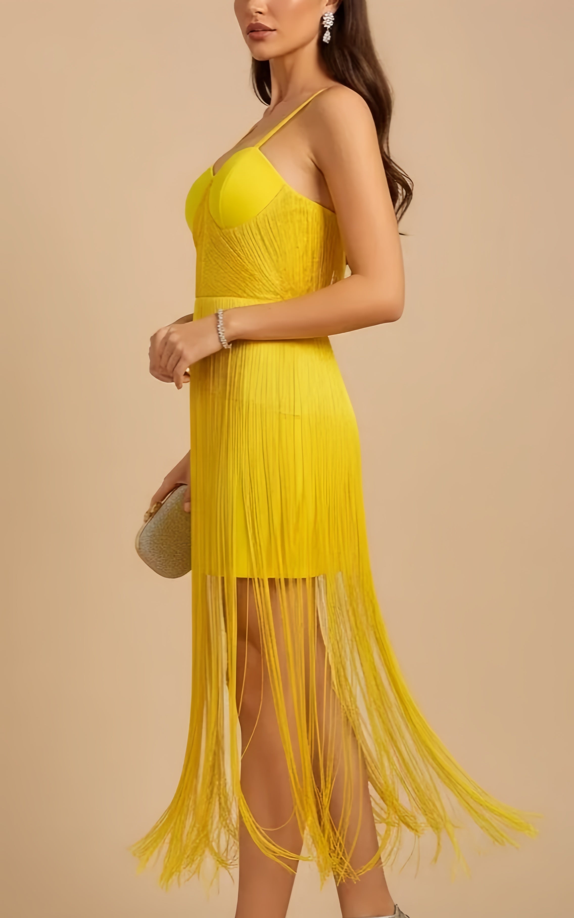 The Juliette Fringe Midi Bandage Dress is a curve-hugging, strap-accented showstopper, with playful fringe that moves with every step. Perfect for turning heads at parties or nights out. Grab yours and steal the spotlight!