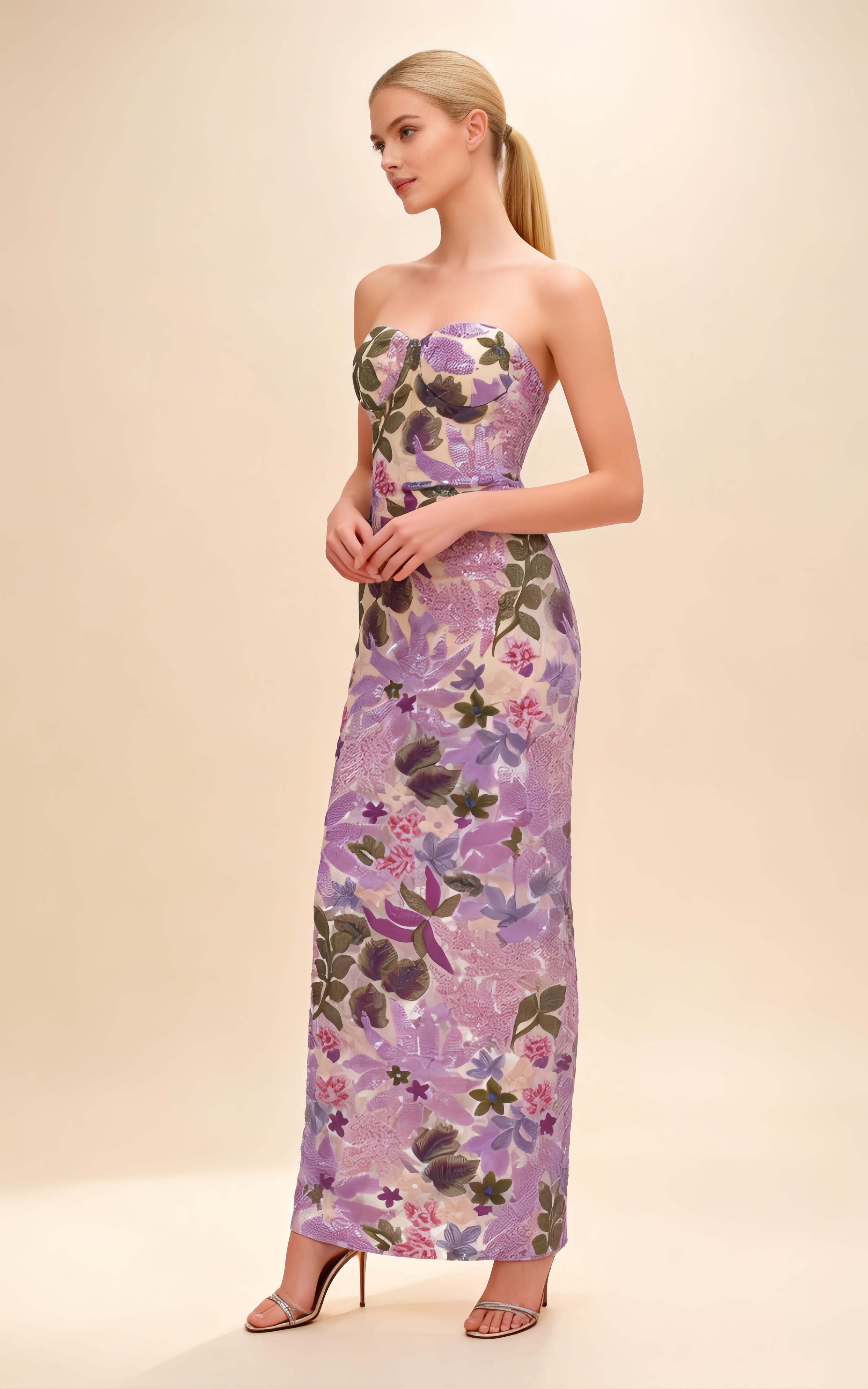 The Livia Lavender Embroidered Strapless Maxi Dress showcases an elegant off-shoulder silhouette adorned with delicate floral embroidery and shimmering sequins. Flowing to a maxi length, it creates a graceful, statement look perfect for weddings, evenings, and special occasions.