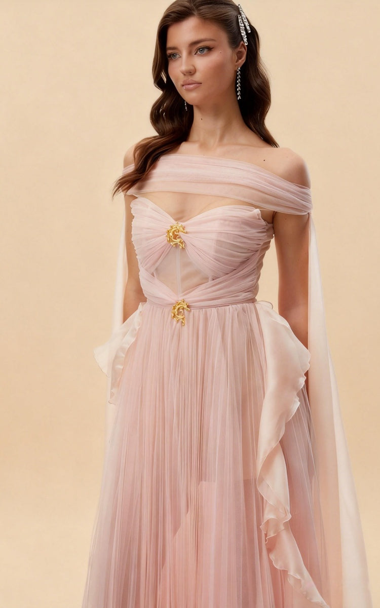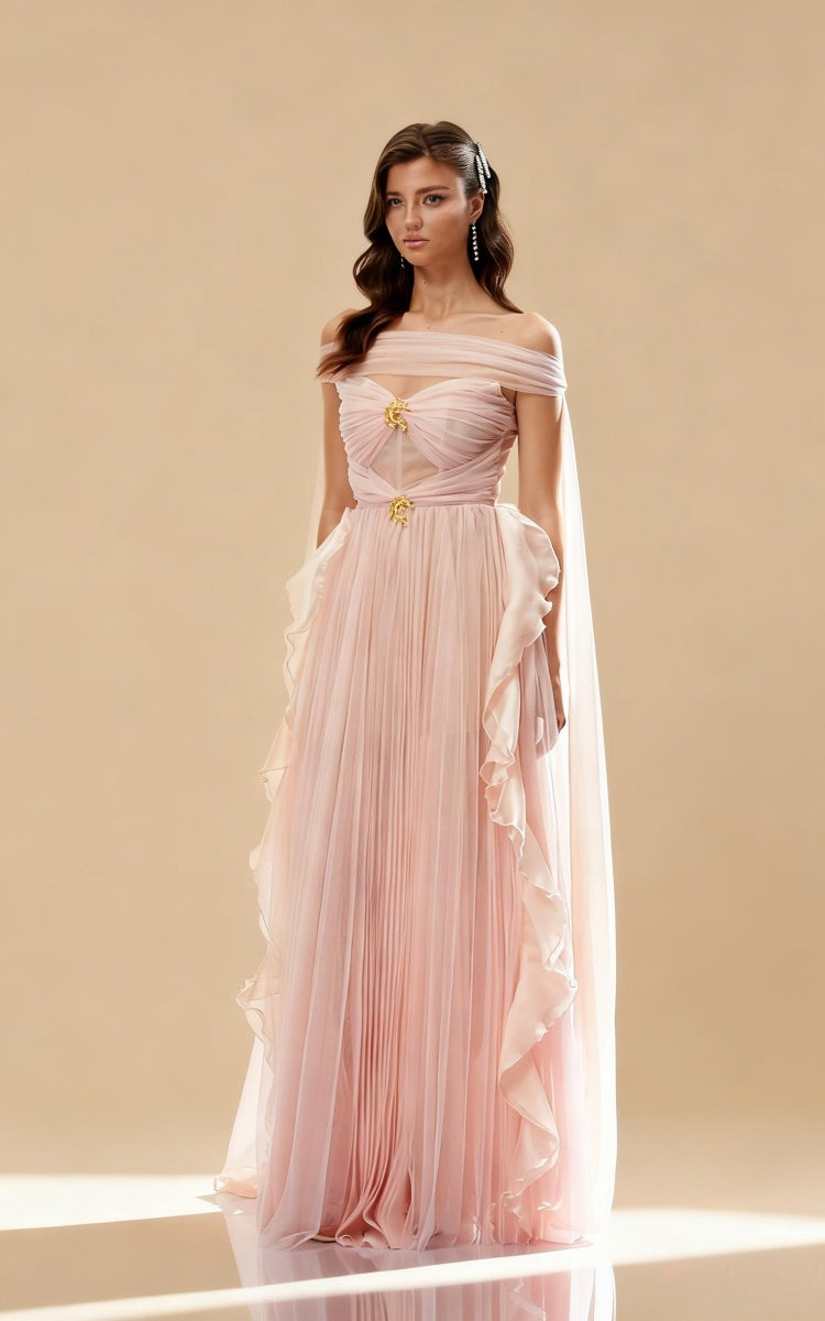 The Mason Off-Shoulder Ribbon Maxi Dress is the perfect combination of romantic elegance and modern design. Featuring an elegant off-shoulder neckline, this dress showcases a flattering silhouette that enhances your figure. The flowing ribbon details add a graceful touch, creating movement and texture with every step. The multi-layered tulle skirt provides a dreamy, voluminous look, making it ideal for formal occasions and special events. Whether you're attending a wedding or gala, this dress is sure to turn heads and leave a lasting impression.
