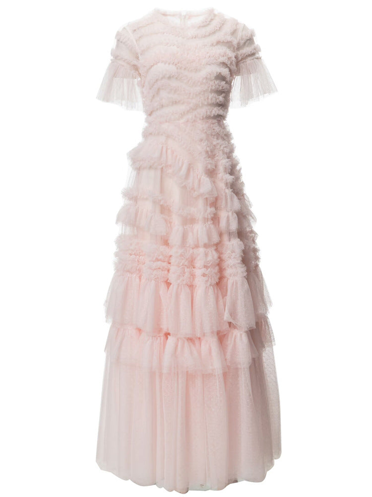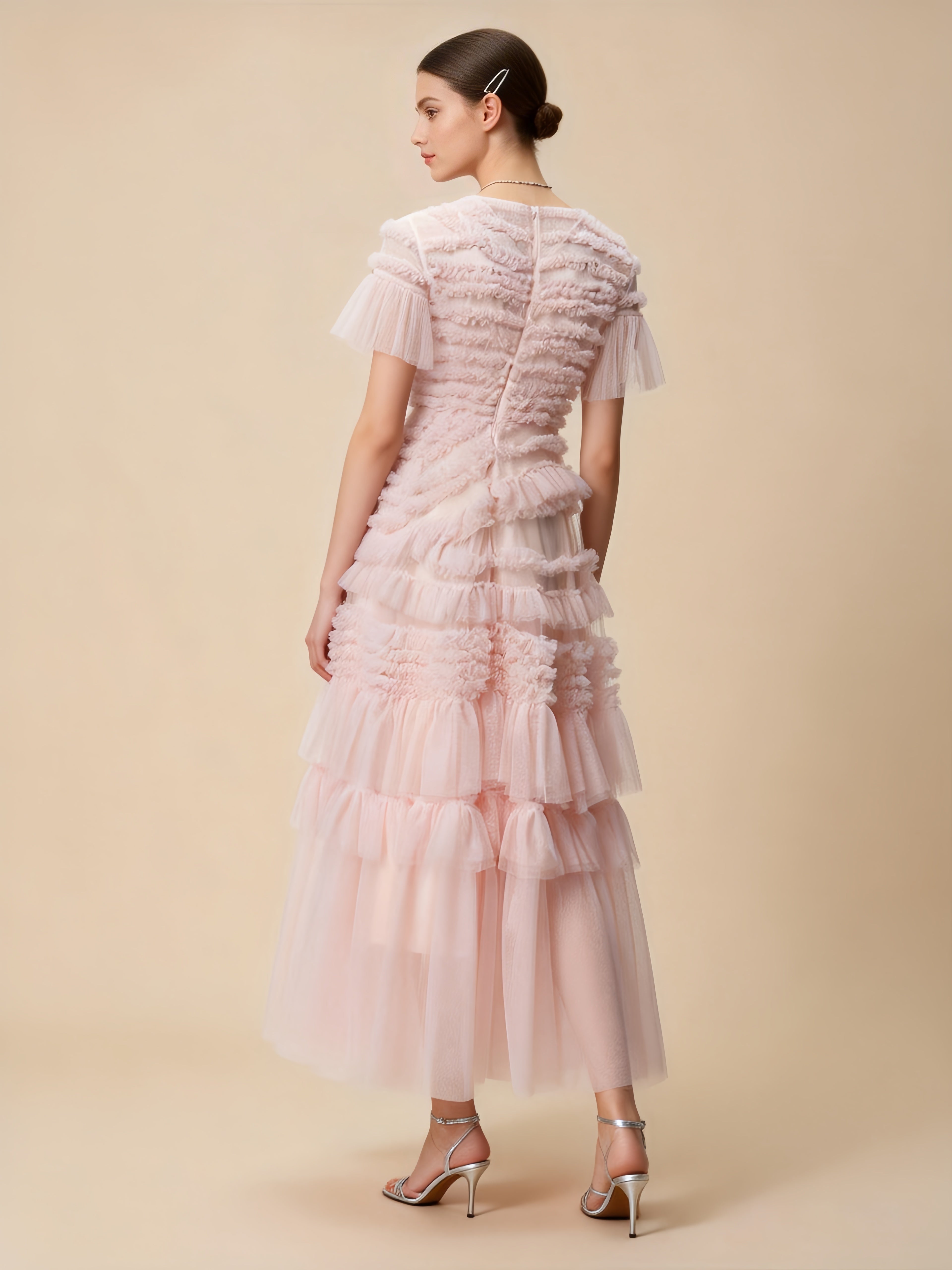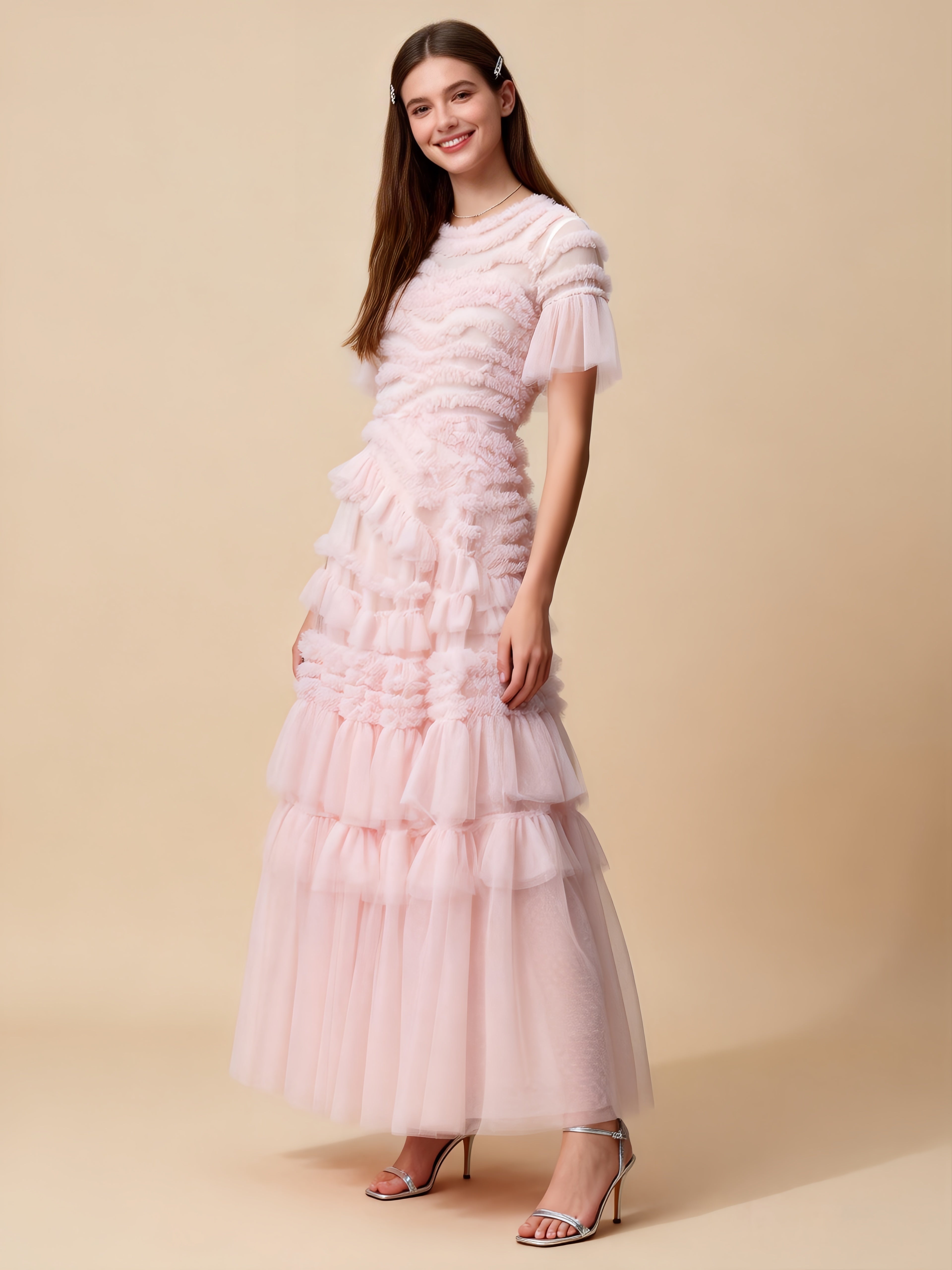 The Naomi Pink Ruffled Short Sleeve Maxi Dress balances modern minimalism and feminine charm with its sleek A-line silhouette and soft round neckline. Crafted from airy, lightweight fabric, the subtle ruffled sleeves add playful texture, while the flowing A-line skirt drapes effortlessly to elongate the figure. The round neck design frames the collarbone with understated elegance, perfect for summer weddings, garden parties, or elevated daytime outings. Designed to move with you, this dress blends comfort and sophistication, ensuring you shine confidently.
