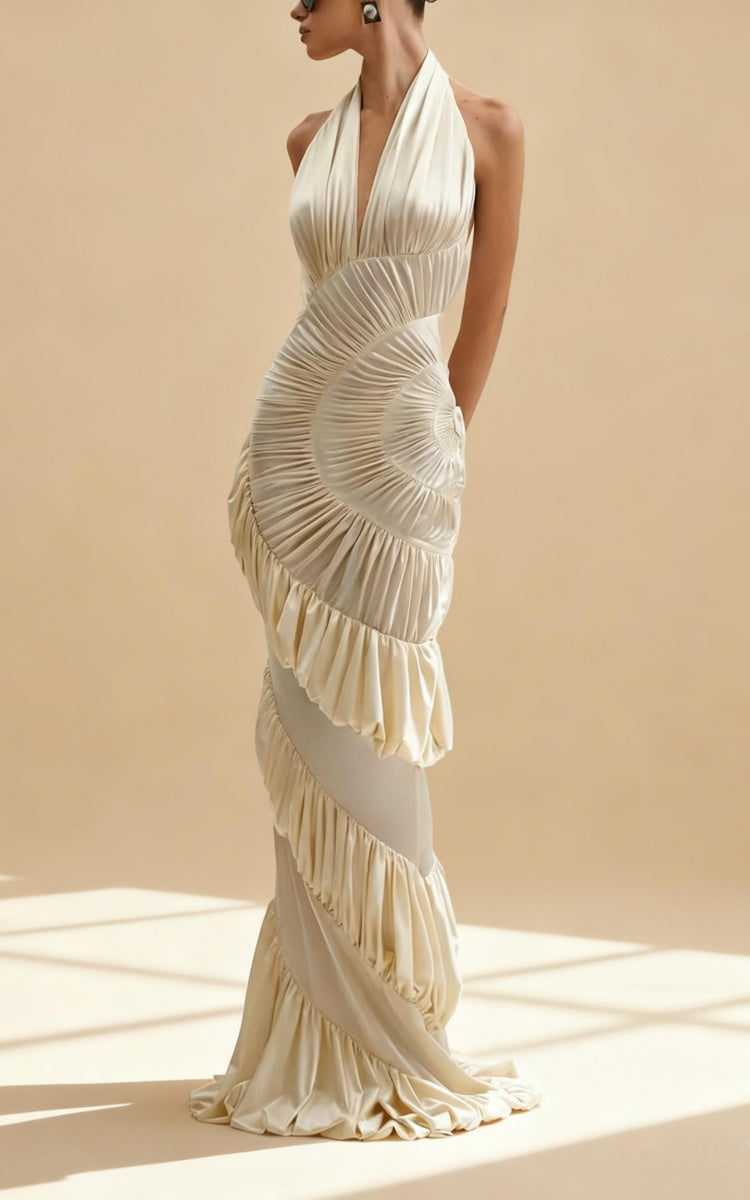 The Parker Apricot Halter Neck Ruffle Maxi Dress perfectly blends elegance with a modern touch. Its sleeveless design and V-neckline beautifully highlight the neck and shoulders. The open-back detail adds a hint of allure, while the asymmetrical ruffled hem flows gracefully, creating a light, airy movement as you walk. The halter neckline accentuates the shoulders, making this dress ideal for both romantic dates and formal occasions.