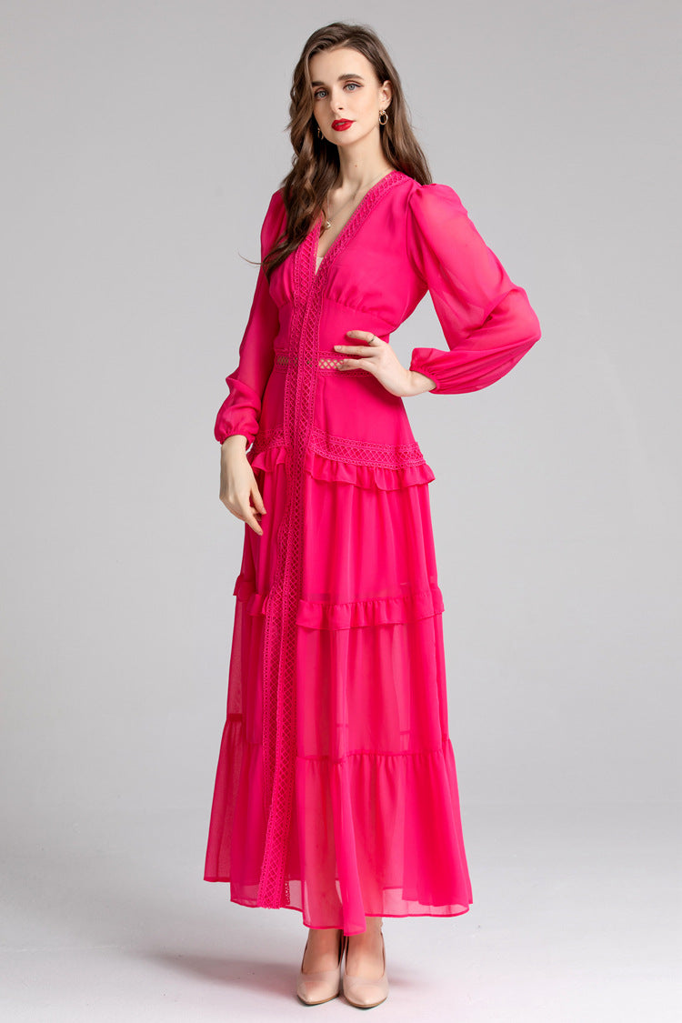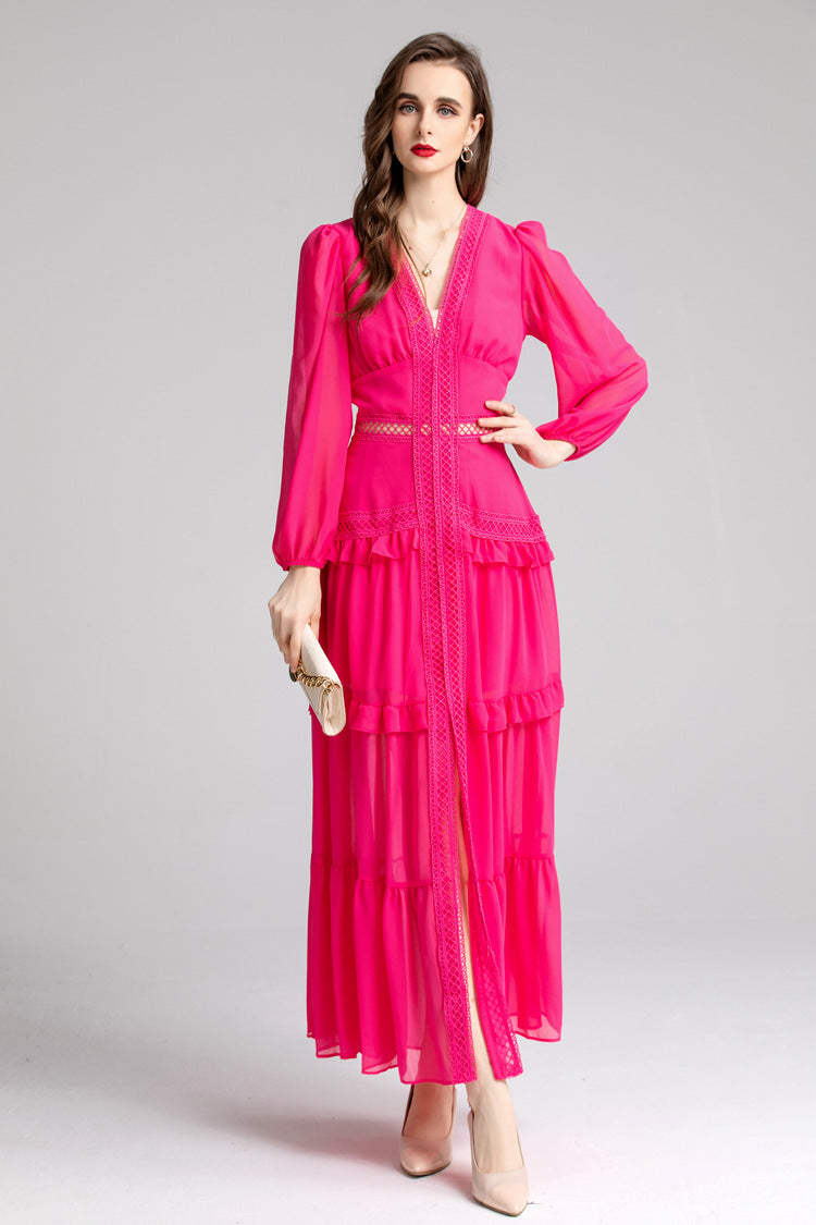 The Sienna Cutout Cake Layered Maxi Dress is the epitome of sophisticated elegance and bold design. Featuring a flattering V-neckline and long sleeves, this dress offers an elegant yet modern appeal. The unique cutout design and layered skirt add movement and intrigue, while the maxi length elongates your silhouette. Perfect for formal occasions, this dress will make you the center of attention.