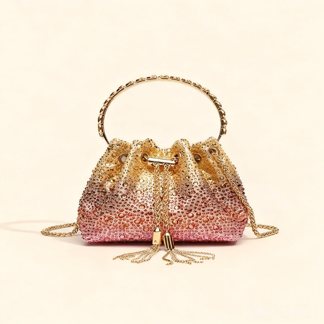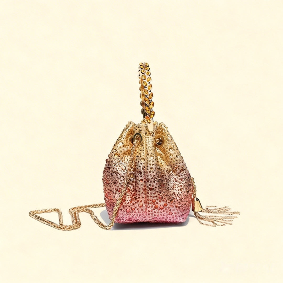 The Talon Gradient Rhinestone Fringe Handbag combines glamour with practicality. Gradient rhinestones adorn the entire bag, catching the light with a mesmerizing sparkle, while the fringe sways lightly with each step, adding dynamic movement. Its bucket bag design offers both ample space and chic style, and can be carried by hand, over the shoulder, or crossbody. Perfect for evening events or parties.