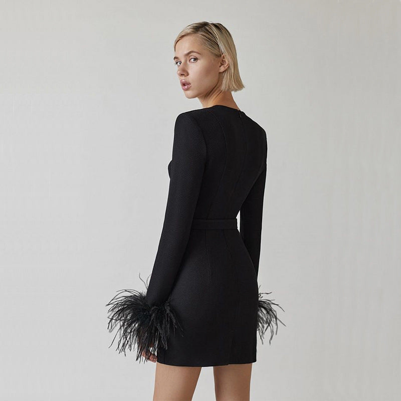 The Tropical Long Sleeve Feather Bandage Mini Dress is the ultimate fusion of bold style and sophistication. Designed with a flattering square neckline and long sleeves, this dress offers a chic, structured silhouette that embraces your curves. Feather detailing along the hem adds a touch of glamour and movement, making it the perfect choice for evening events or tropical getaways. Crafted from high-quality bandage fabric, it provides comfort and shape, ensuring you turn heads wherever you go.